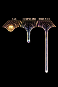 Mass bends spacetime. Objects move along the bends. A black hole makes a very, very big dent. That’s why everything – even light – gets sucked in. They can’t escape the pull. That’s why we orbit the sun. It’s a balance of push and pull that makes us orbit the sun.